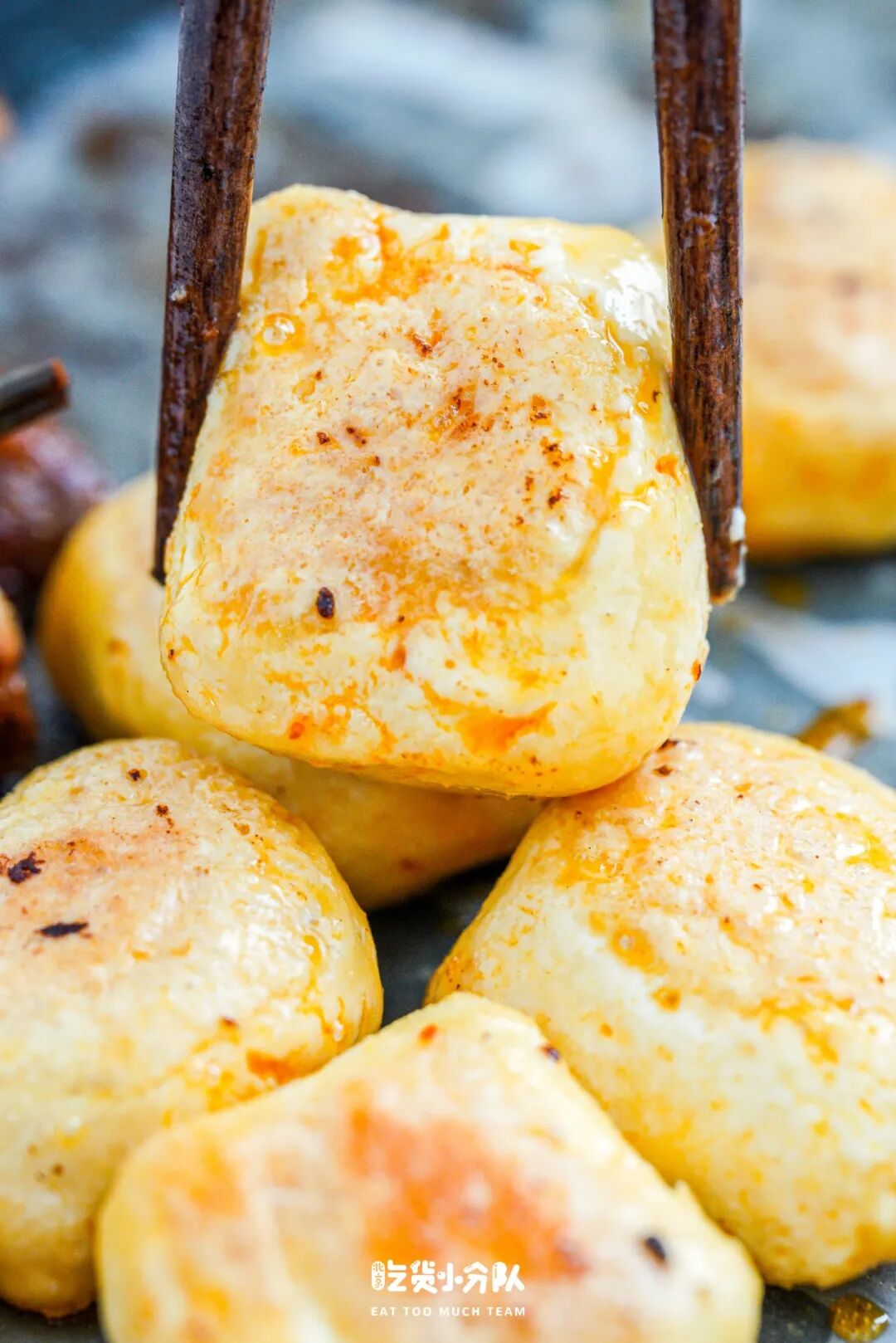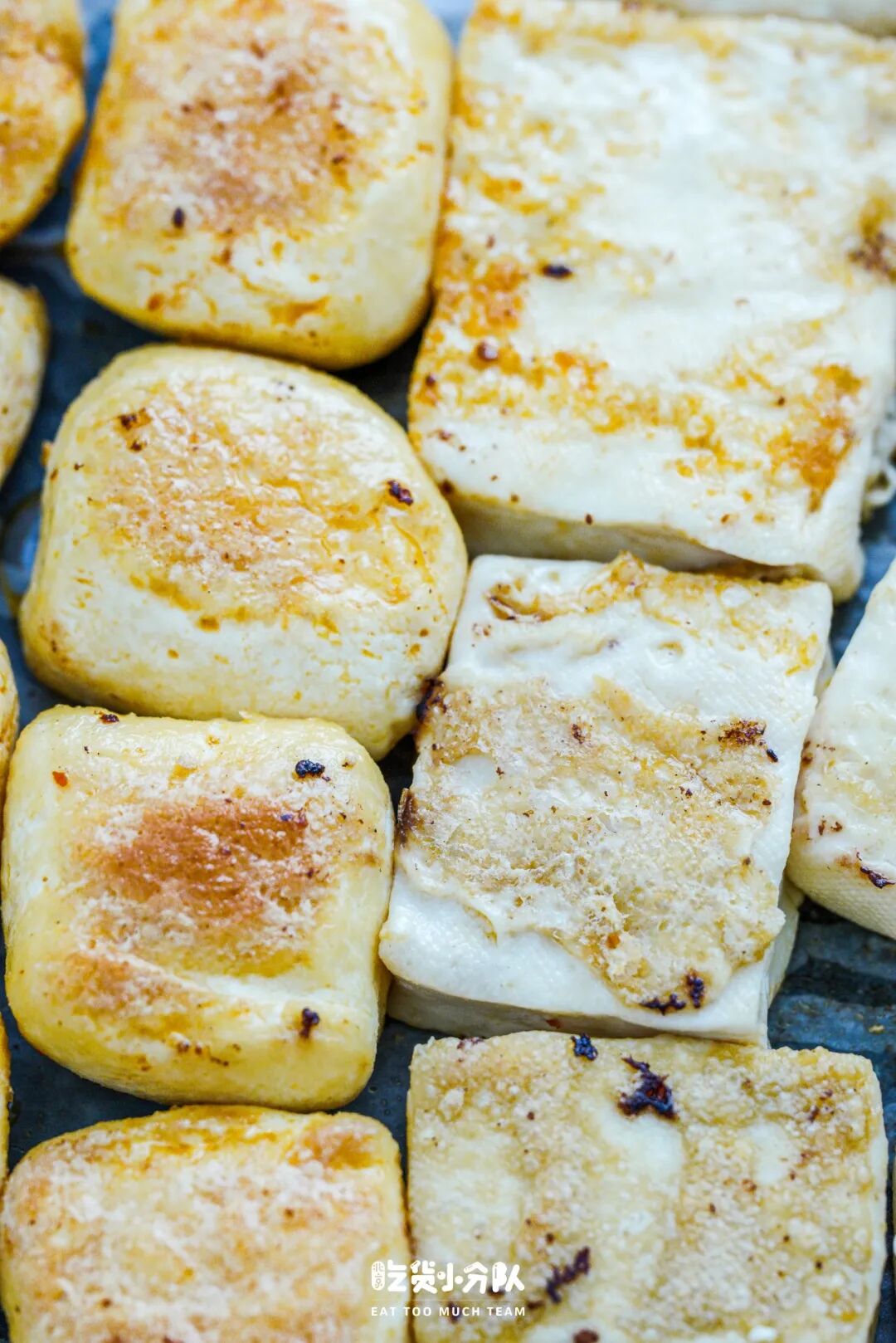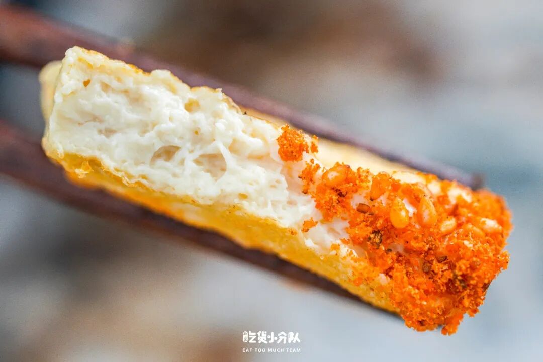 包浆豆腐是方方正正的切片状,烤到表皮金黄微微焦即可,烤好后外焦内软、弹弹的不要太香!一定记得沾上辣椒蘸水,咸咸的辣味特别搭。
