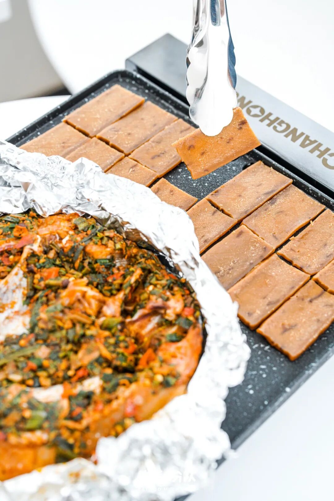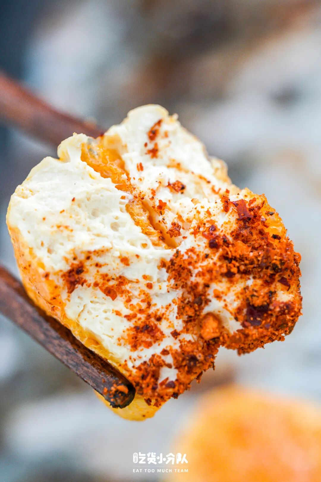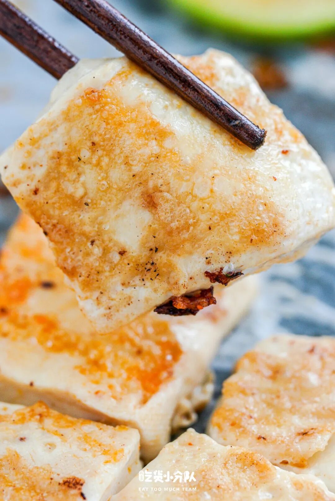 包浆豆腐是方方正正的切片状,烤到表皮金黄微微焦即可,烤好后外焦内软、弹弹的不要太香!一定记得沾上辣椒蘸水,咸咸的辣味特别搭。