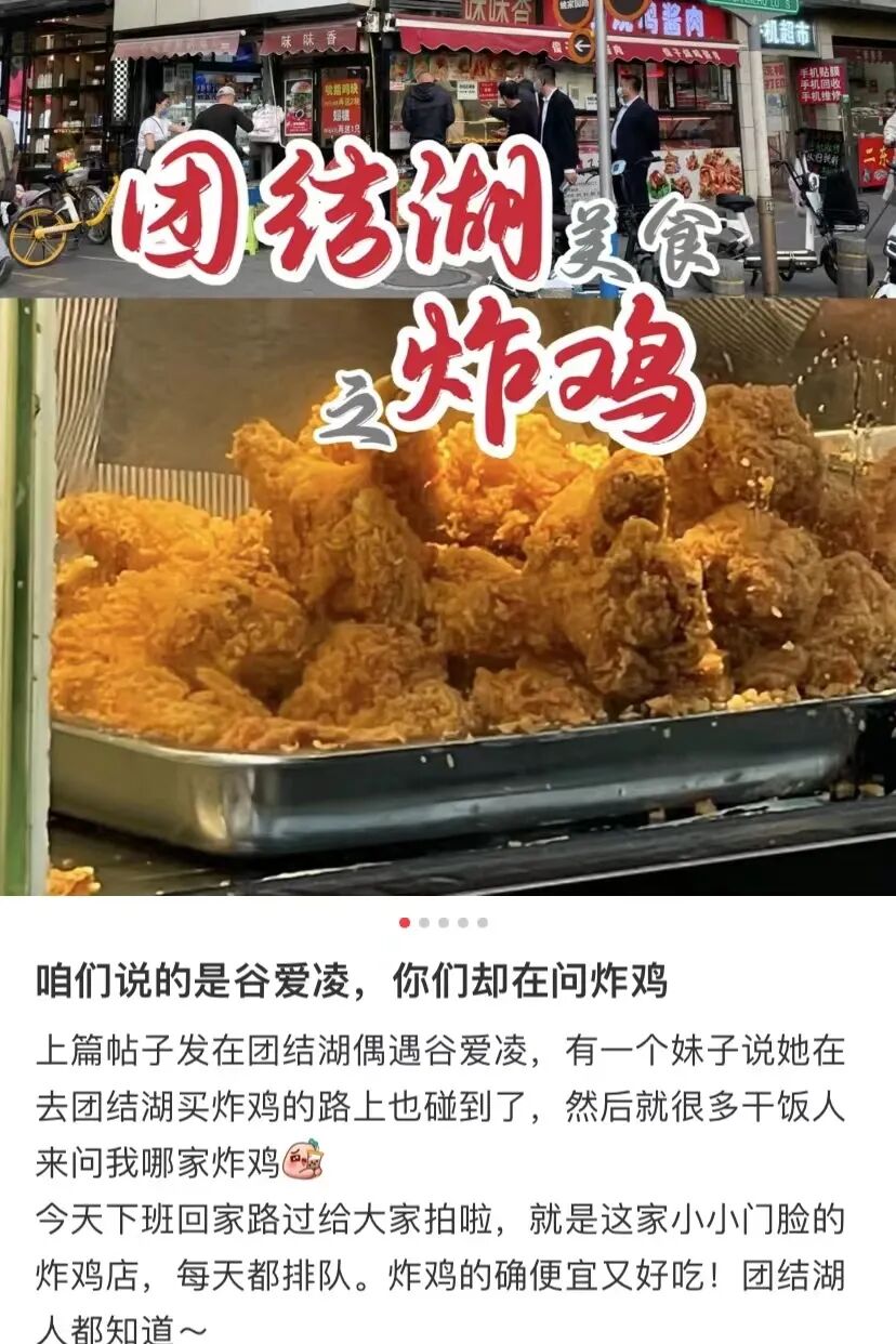 网友在团结湖附近买炸鸡偶遇了谷爱凌跑步,发到社交平台上,没想到意外带火了炸鸡店,在小红薯和点评网上都引起了不小的热潮。