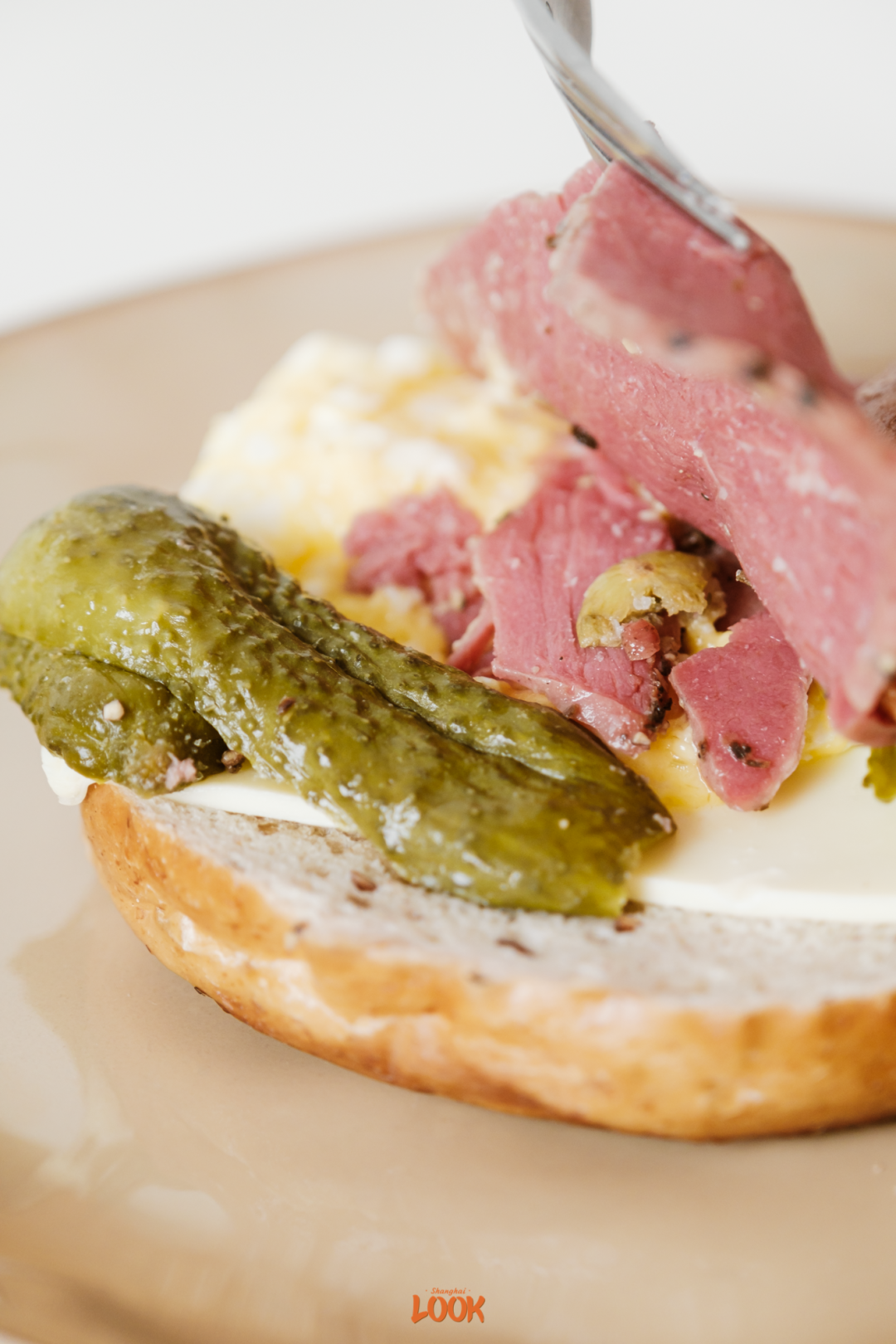 *图为Abendbrot贝果标配,很德式三明治的口味,鸡蛋沙拉、酸黄瓜、黑椒牛肉、奶酪;需要叫外卖才能点到,网店只卖贝果,这里作为DIY三明治参考提供给大家,操作简单且美味!