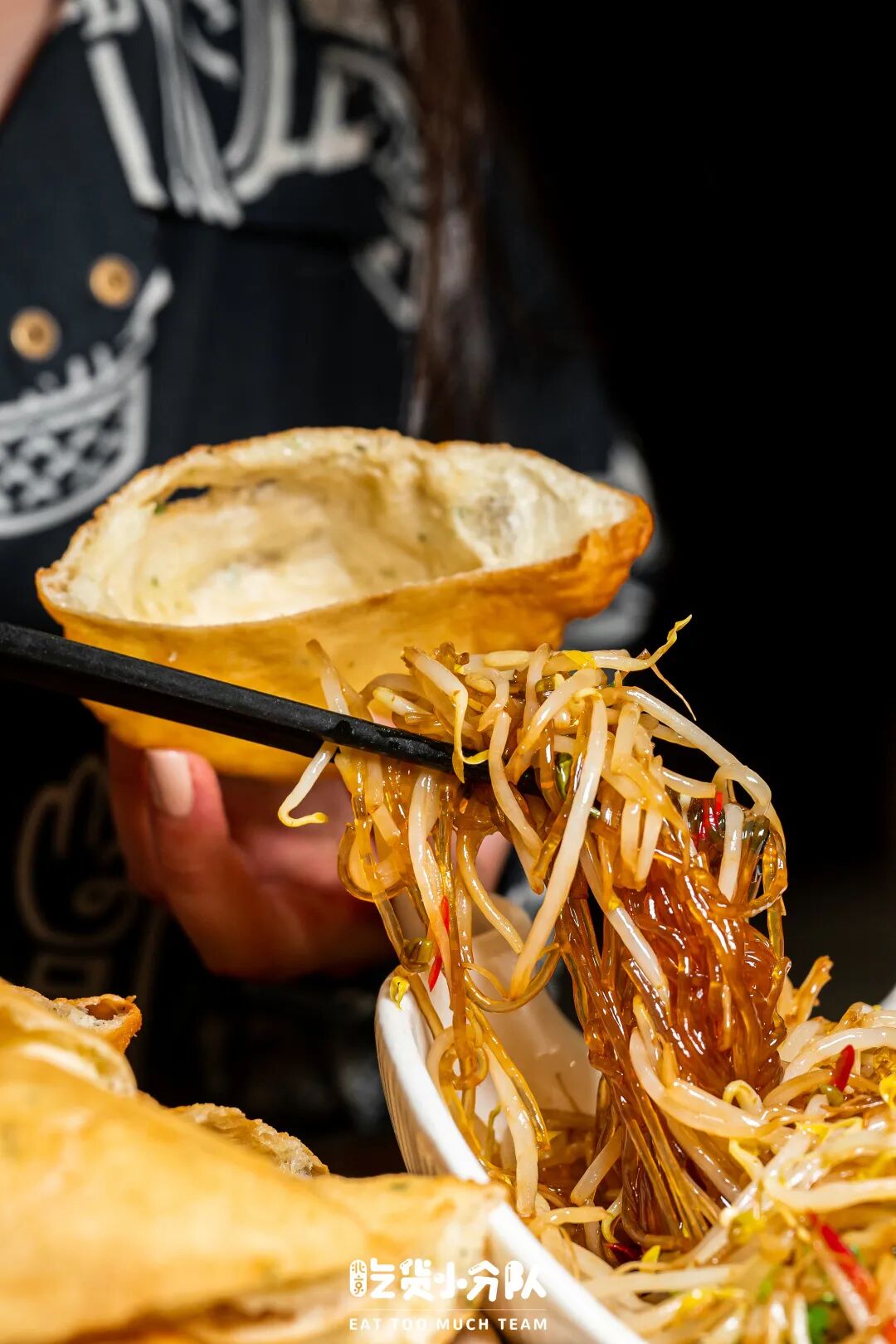 搭配的豆芽炒粉条是酸溜溜的调味,官方吃法是夹进油饼里。口袋的形状很好操作,不仅加得多,还不怕漏。