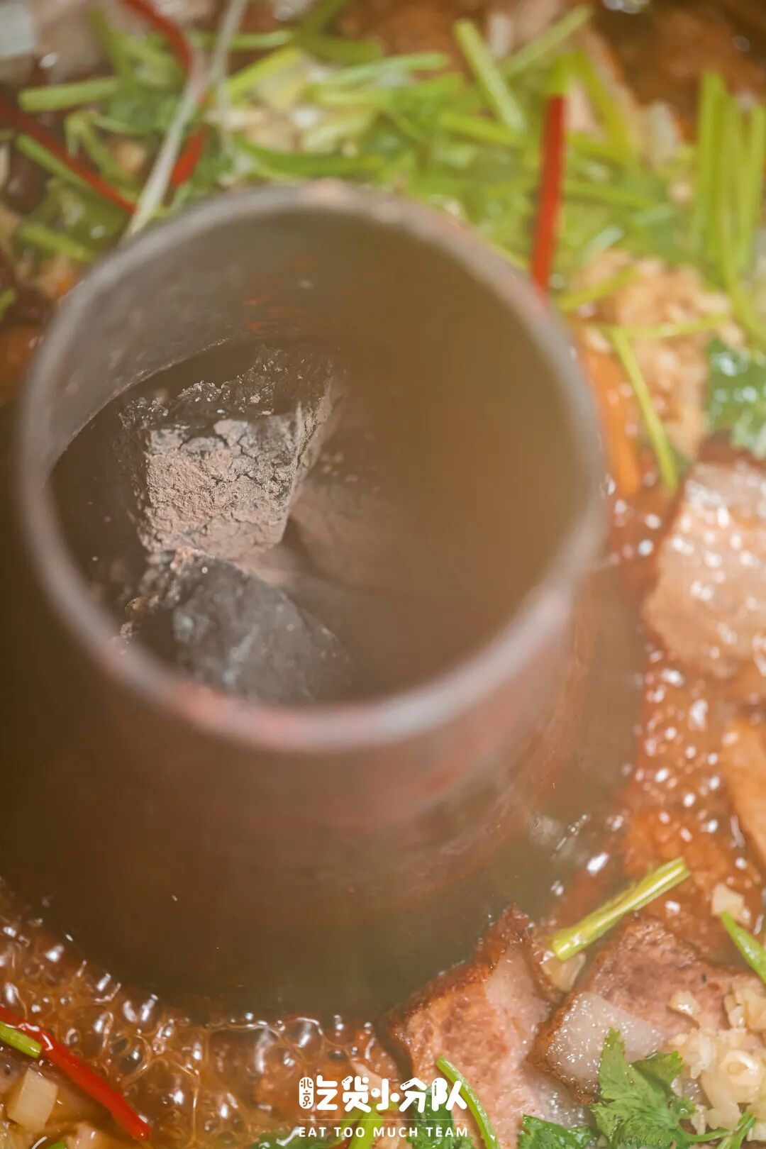 锅中间是炭火,烧得汤一直滚沸。店员阿姨还贴心地拿来一盆火锅原汤,觉得汤少了就可以自己加些进去。这个火锅整体是咸鲜口儿的,如果觉得清淡,可以要一碗辣椒油蘸着吃~