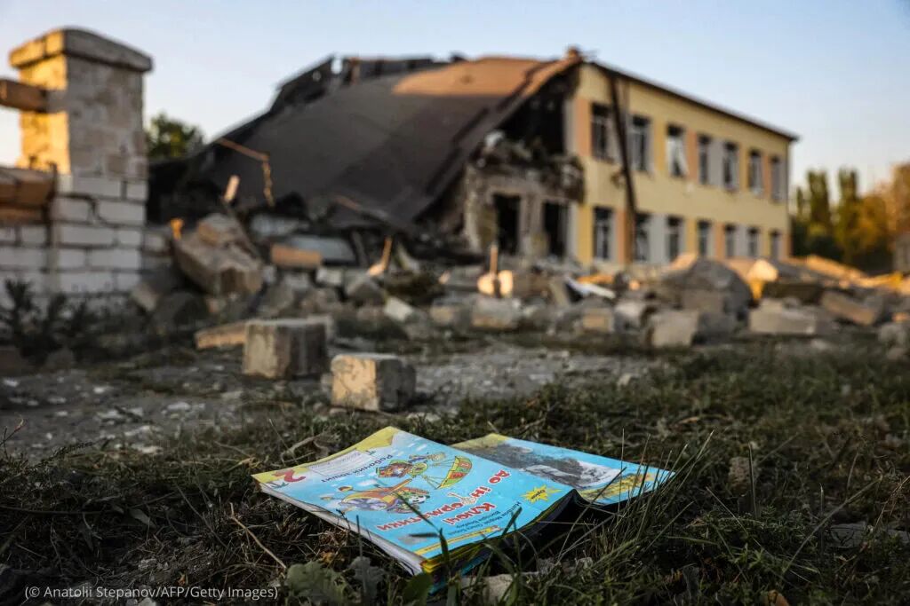 8 月 30 日,顿涅茨克地区一所被导弹摧毁的学校前散落着一本教科书。据联合国儿童基金会的数字,俄罗斯的入侵使 300 万儿童流离失所,导致 2 月至 6 月期间 200 多万儿童离开乌克兰。(© Anatolii Stepanov/AFP/Getty Images)