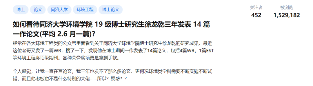 近日,「如何看待同济大学环境学院 19 级博士研究生徐龙乾三年发表 14 篇一作论文(平均 2.6 月一篇)?」登上知乎热榜引起热议。起因是有位题主经常在各大环境工程类的公众号里面看到关于同济大学环境学院博士研究生徐龙乾的研究成果。搜索了一下,才发现徐龙乾在博士期间一作发表了14篇论文,包括4篇WR,1篇EST等环境工程类顶级期刊。各种荣誉奖项更是拿到手软。![]()