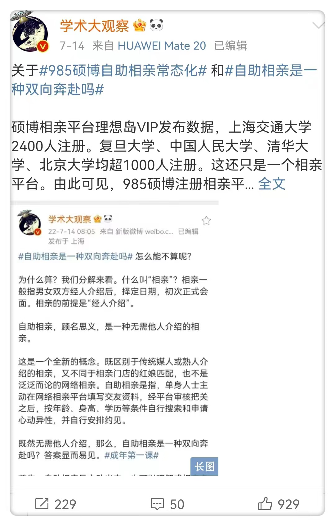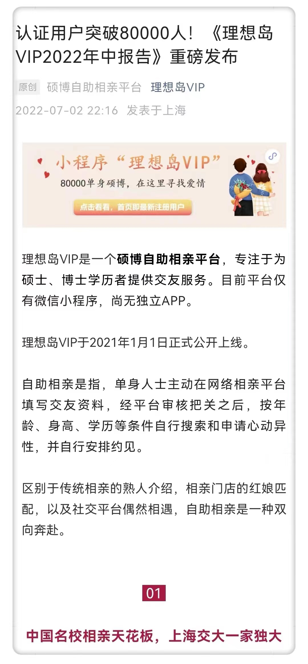 截至2022年7月1日,理想岛VIP认证用户突破80000人。其中,来自985、QS前100以及中国科学院大学等顶级高校的用户总和,超过65000人,占比达81%。用户来自最多的十所高校,几乎略等于中国十大名校。不过排名首位的不是清华北大,而是上海交大。上海交通大学注册用户超过2400人。另外九所,中国科学院大学、复旦大学、中国人民大学、清华大学、北京大学,注册用户均超过1500人;中山大学、浙江大学、华中科技大学、武汉大学,注册用户均超过1000人。有分析认为,清华北大3000多名研究生“在线选对象”,预示着“自助相亲”时代已经来临。自助相亲,将会是中国婚恋市场的一种新模式、新趋势,而这个新趋势的最大特征是,由中国名校生引领。7月14日,连同“自助相亲是一种双向奔赴吗”一起,微博大V“学术大观察”做了详细阐述。![]()