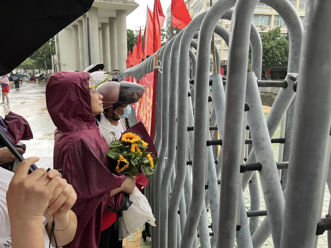 身穿雨衣,手捧鲜花迎接考生