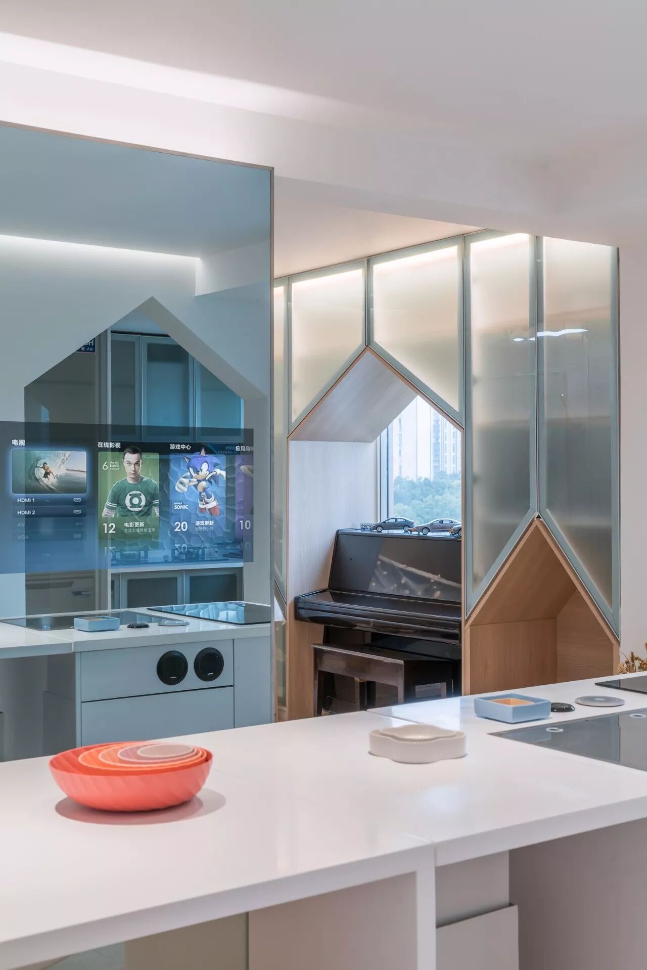 △ 从钢琴区域到儿童区视角,定制的弧线通电玻璃可以在开启时雾化(GIF)