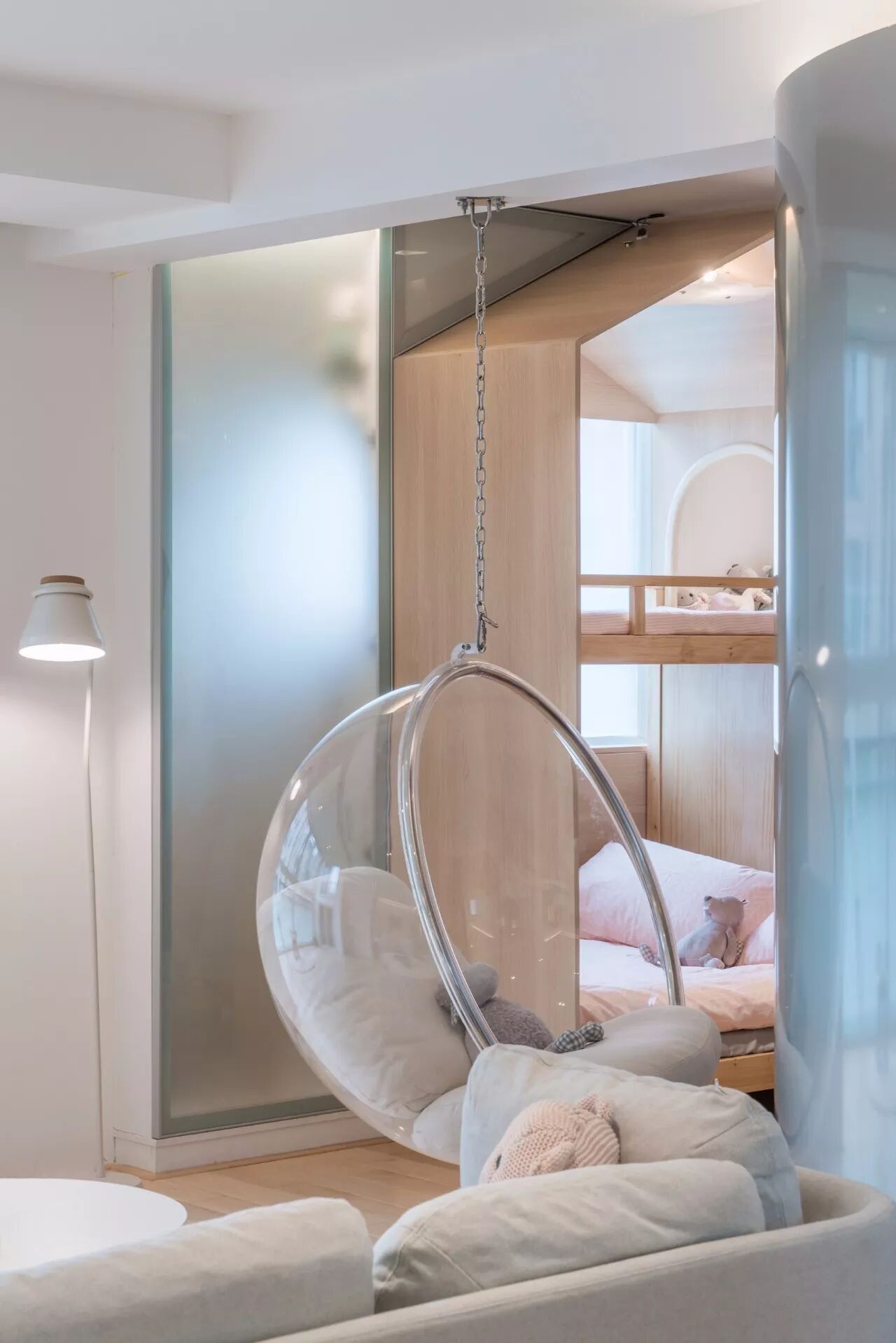 △ 手工的上下铺儿童床,滑梯以及树形的书架,设计师为自己女儿设计的云灯光线柔和可以当夜灯使用
