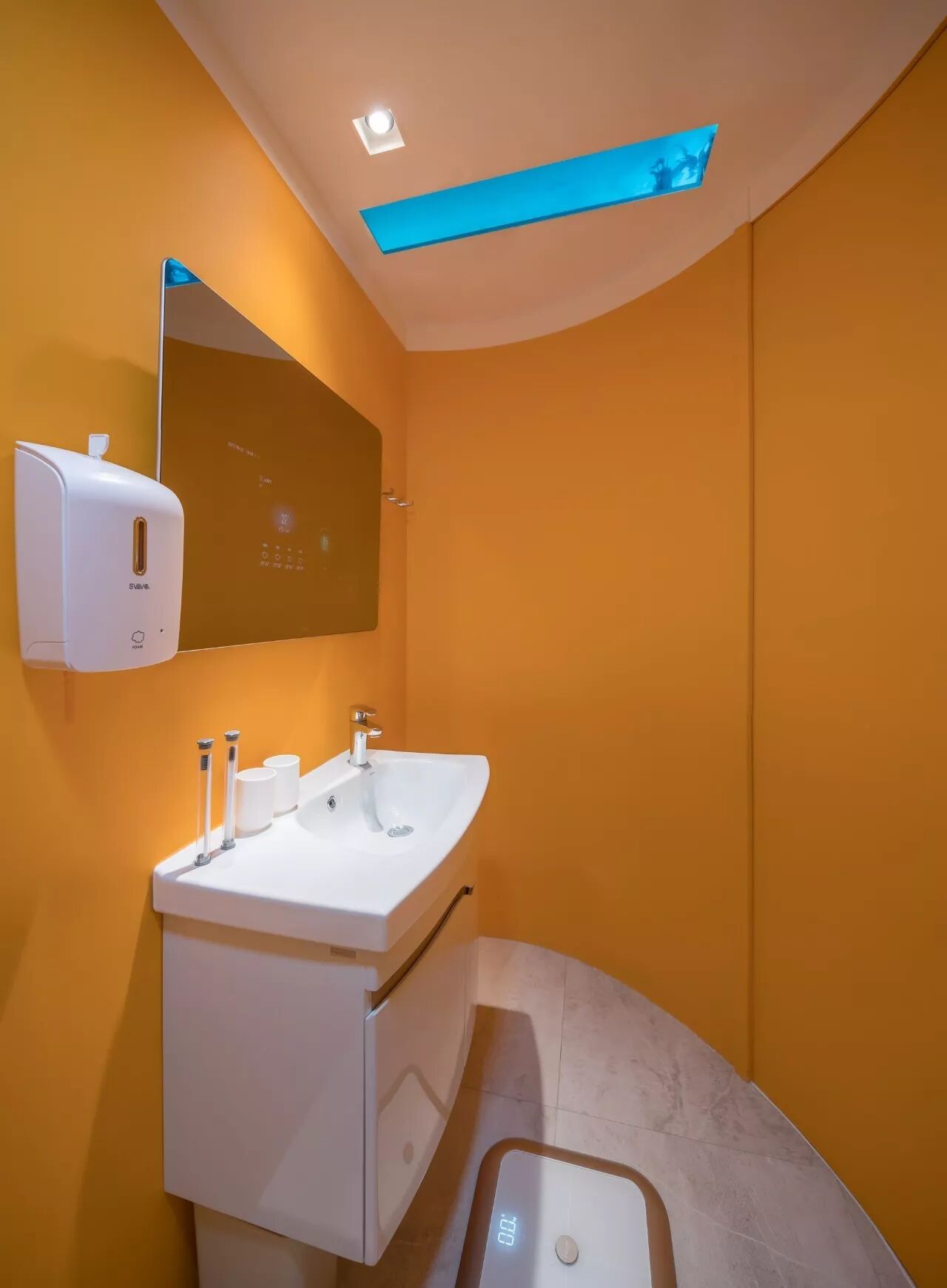 △ 厕所区域用了明亮的橘色,蓝色的天窗可以开启通风透光,让空间不显得密闭