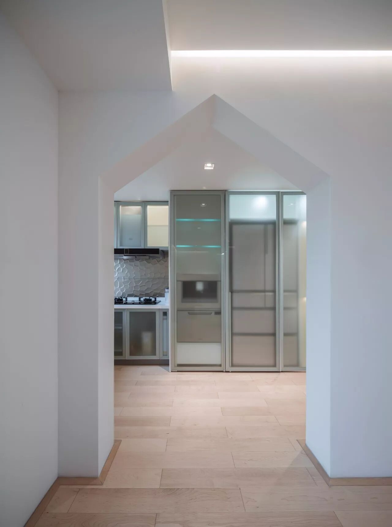 我把所有的柜子都沿着墙布置,柜门全用的是磨砂玻璃,仿佛在实体墙前面升起了一层雾,这雾后面是鞋子及箱子,各种家电,衣物,杂物和户主父亲的画作。