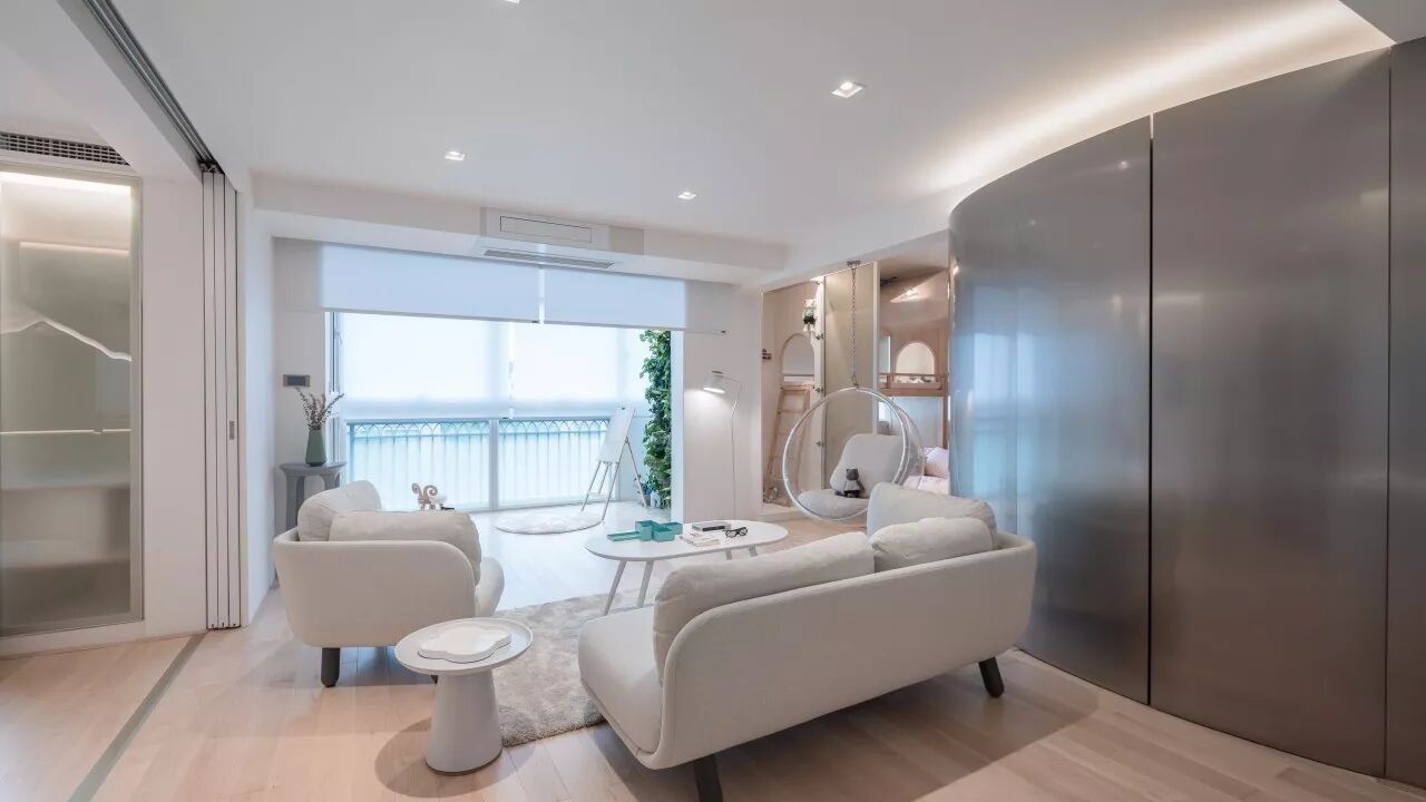 △ 柔白色的电动卷帘可以安静的全幅落下,将屋子做柔和的隔断,同时也满足了私密性(GIF)