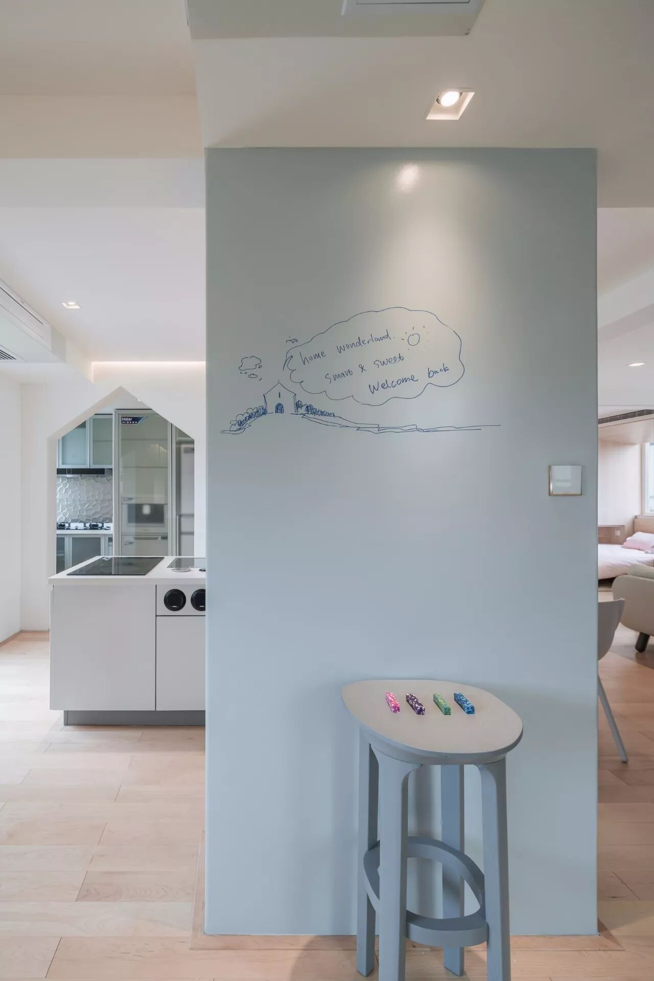 △ 特质的画墙,透明白板漆的覆盖可以让孩子可以在上面任意的画画,发挥想象力