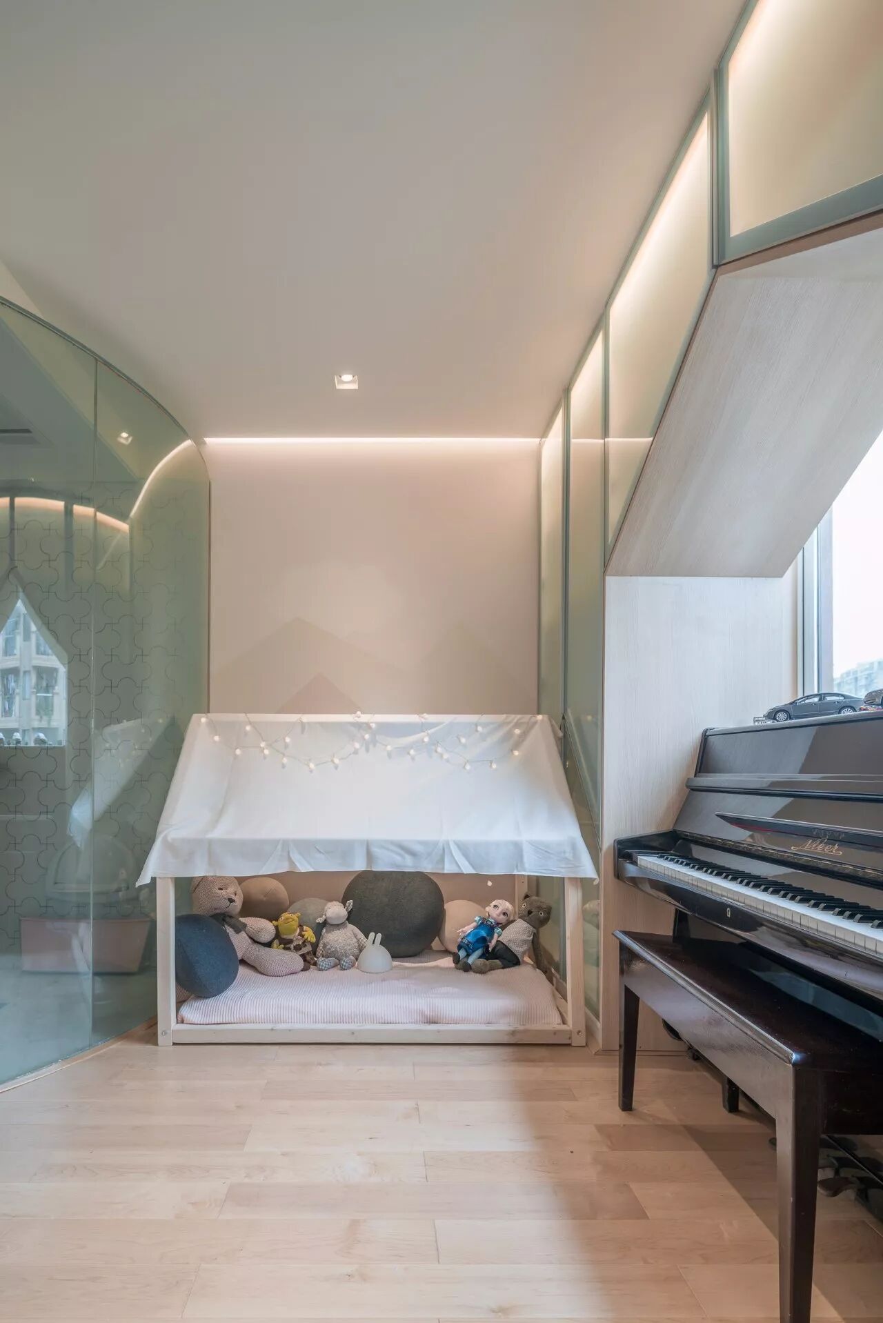 △ 在钢琴的边上为孩子搭建了一个帐篷,孩子可以安全安心的在里面游戏或者休息,业主在弹钢琴时候也可以陪伴在孩子身边