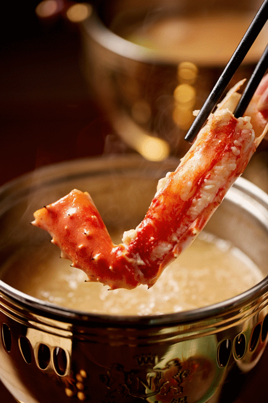 从阿拉斯加空运直飞上海的鲜活帝王蟹,张牙舞爪直接送入厨房,在精细改刀后以最方便入口的状态送上桌。北太平洋的冰冷海水赋予其弹牙紧致的蟹肉,为了可以品到蟹肉的原味,烫涮就再适合不过了。
