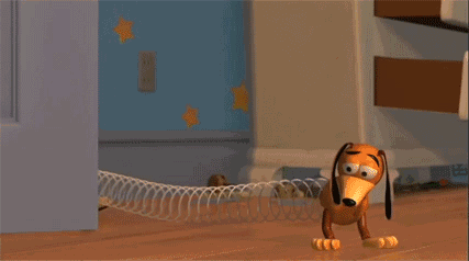 弹簧狗绕着一个盛满了玩具骨头的大狗盘,对自己的尾巴穷追不舍了一整天,把其他玩具们都逗乐了。