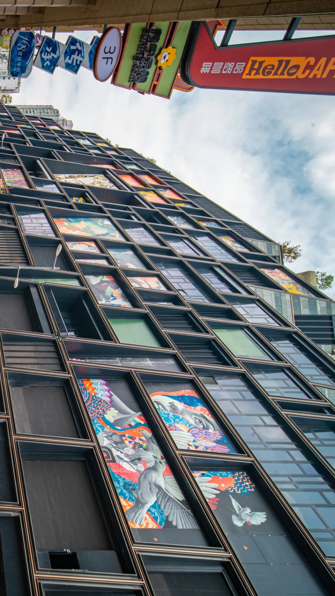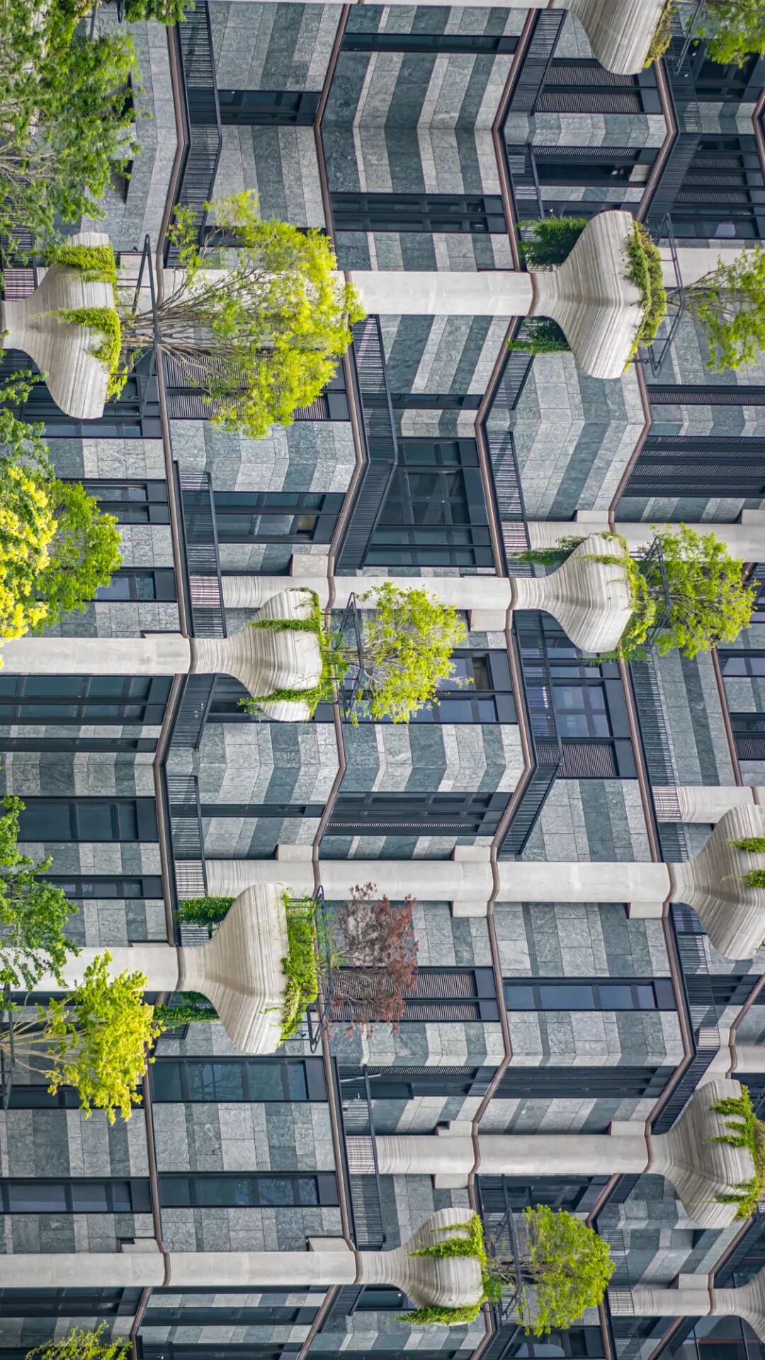 项目沿阶梯而上,在400级台阶、数百根清水混凝土生命立柱上种了70余种、20000多棵植物。远远望去,好像一座绵延大山;走到莫干山路这一侧,又像是大山从中间被一刀切开般陡直,外墙立面上还印有16位世界级大师留下的艺术涂鸦,这些作品都将被永久保留!