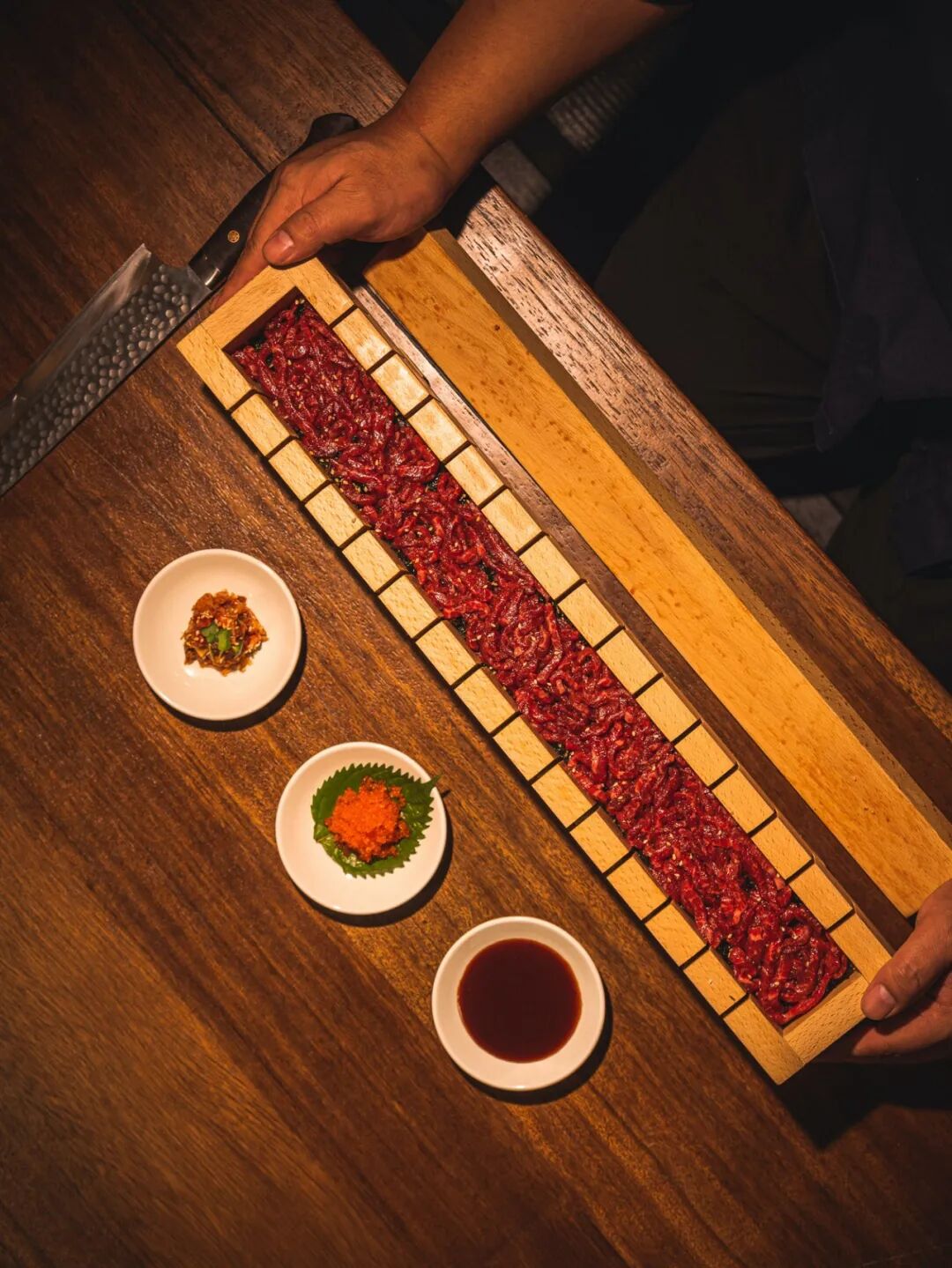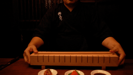 长达50cm的特制生和牛箱寿司,直接到面前切分脱模,仪式感超强~