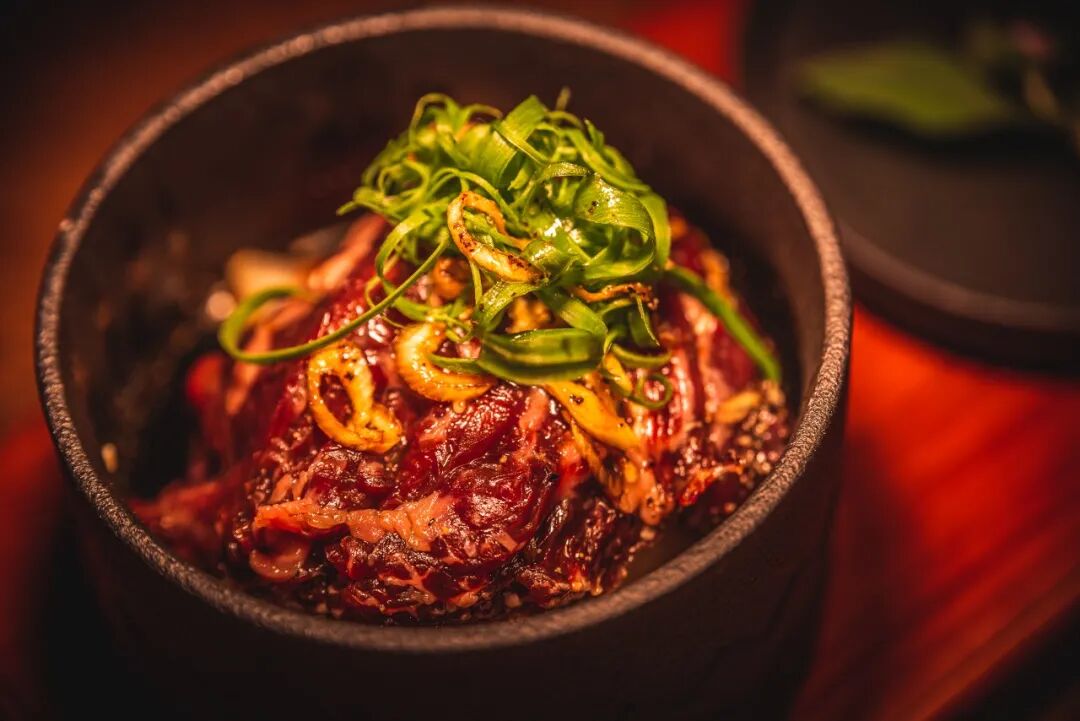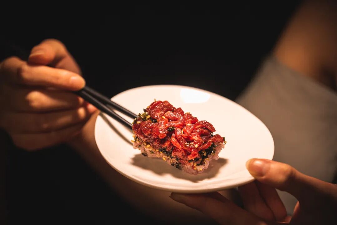 寿司饭用血糯米及大米混合制作,口感更佳立体,嚼劲更足。中间放入海苔,再覆盖上以酱汁调和的生牛肉,扎扎实实地铺满,很壕很满足。