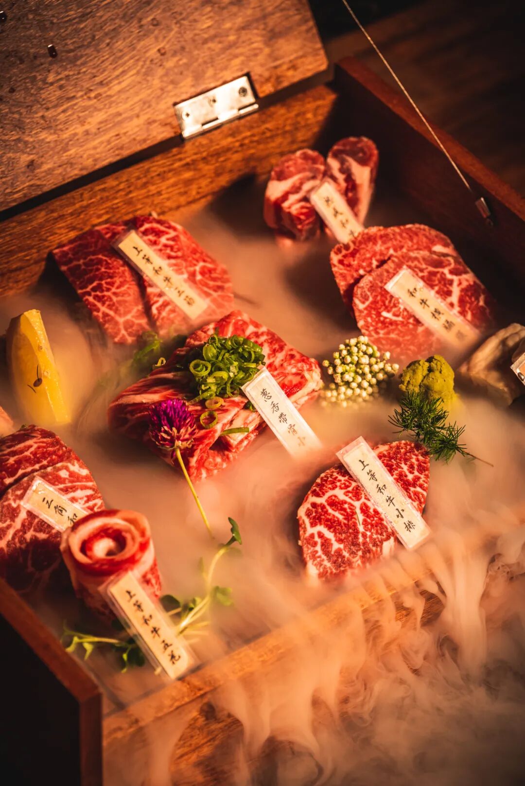 每桌必点的八百里全品超盛合,神秘地盛在大木盒中,打开一瞬,仙气缭绕。和牛9大部位集中于此,让人尽享吃肉的快乐。