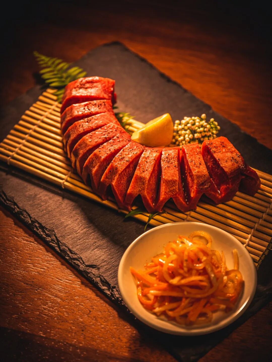 保留牛舌本身的姿态,围成一圈烤制,丰富的油脂同时释出,外表的焦香与切面的滑嫩形成鲜明对比。