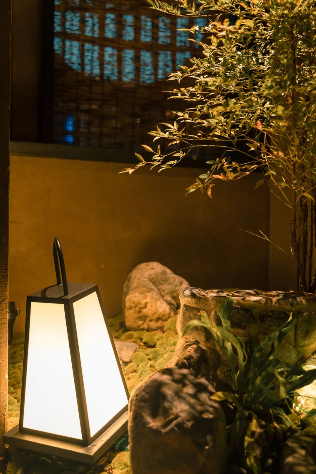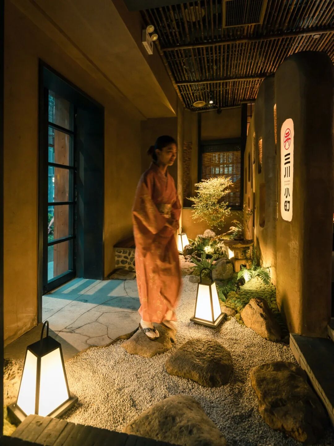 推门而入,一方庭院景观映入眼帘,流水潺潺,青苔幽幽,把日式和寂之美展现得淋漓尽致。