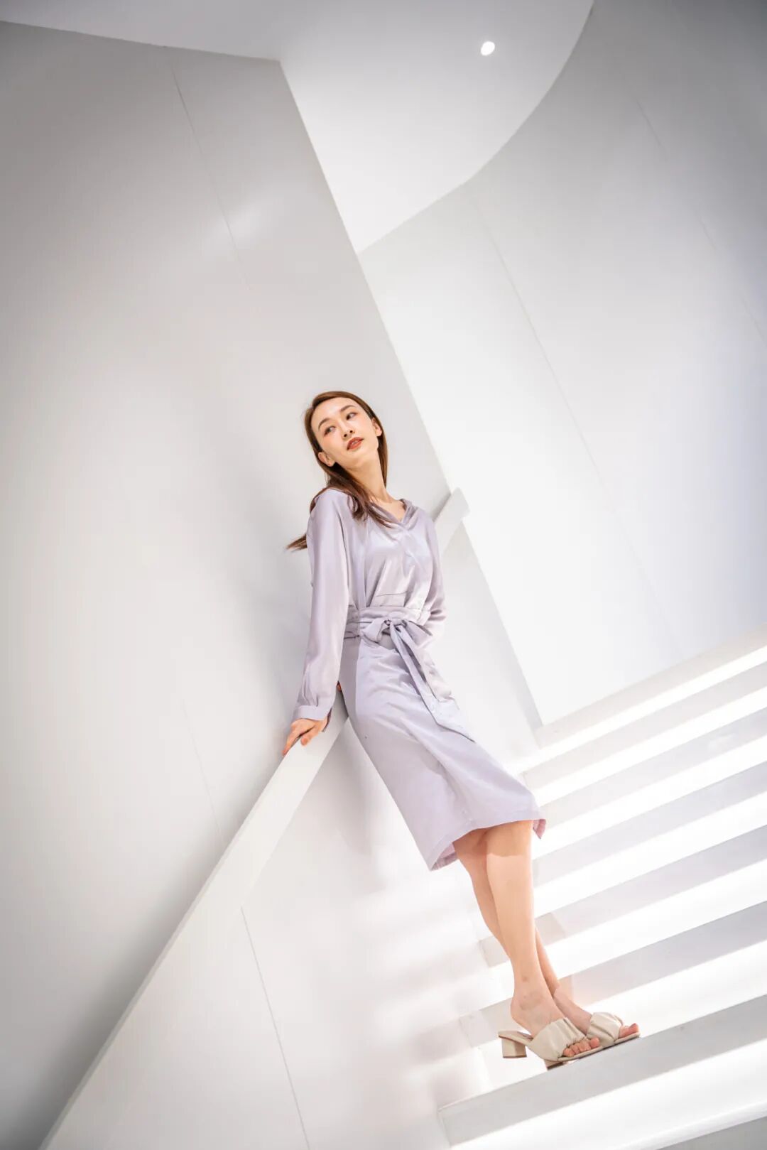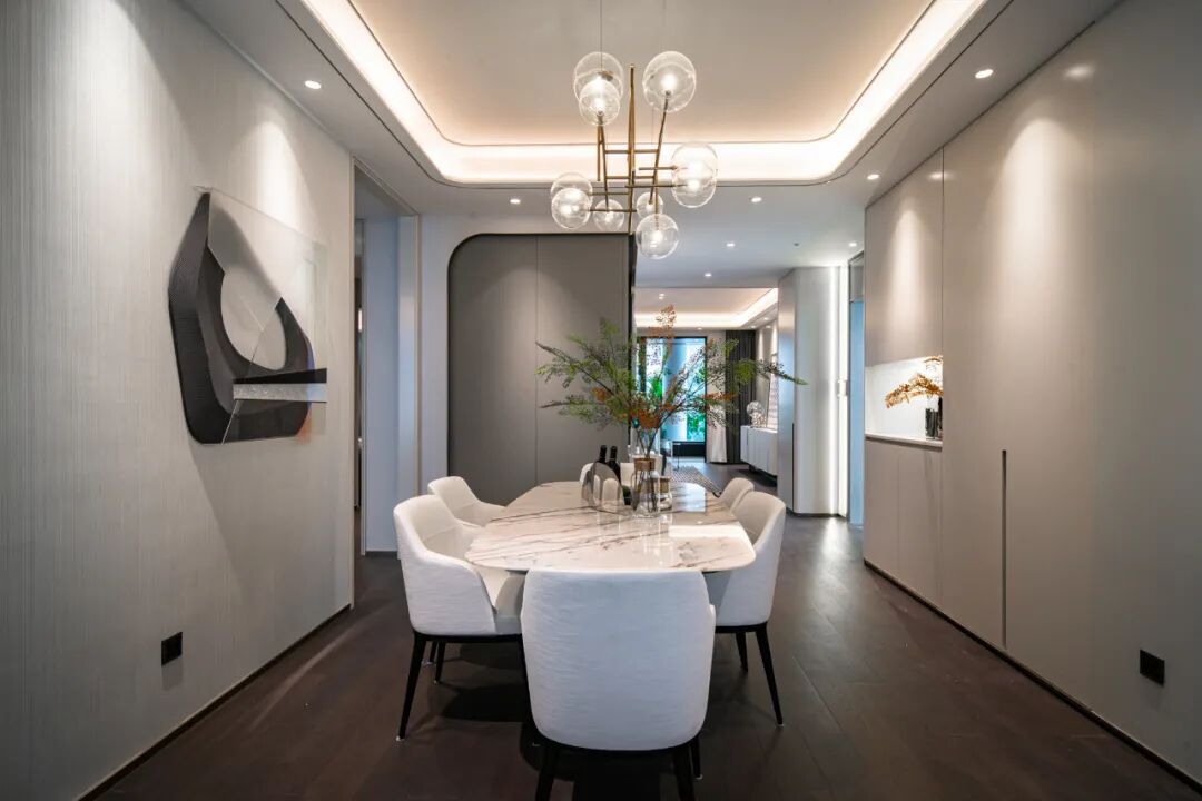 纯白背景色,半通透的材质与灯光的结合,再搭配莫兰迪色几何挂饰隔断,时髦中流淌着岁月静好。