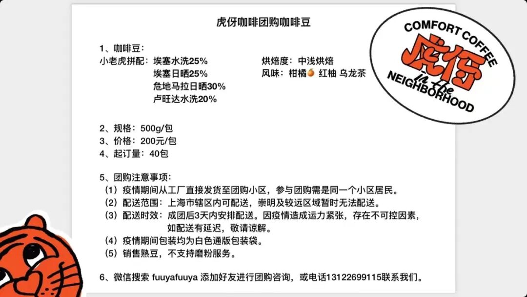 我们联系了工厂,可以直接发咖啡豆到小区,一个地址20包起订。因为上海疫情影响,未来很长一段时间会不能堂食,解封后我们会专注于线上的外卖,希望可以出一些不到店也可以感受到有趣体验的方式吧。