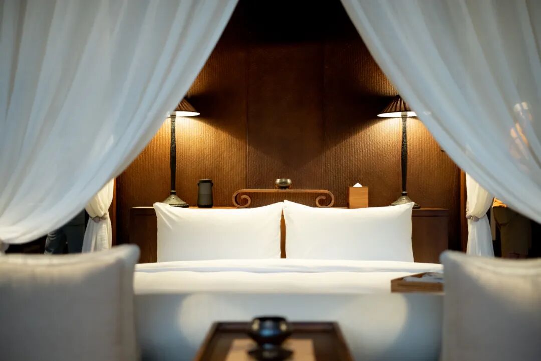 【枕梦客房】80-90㎡,房间安静舒适,通透的落地窗,中式古朴雅致的家具风格,搭配柔和的暖光,让人感觉到极度的舒展放松。
