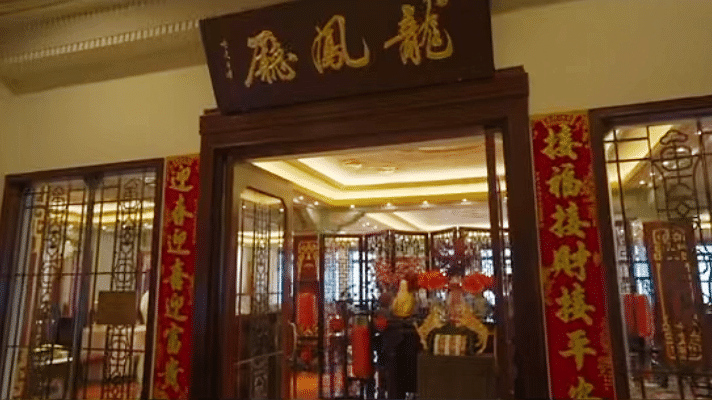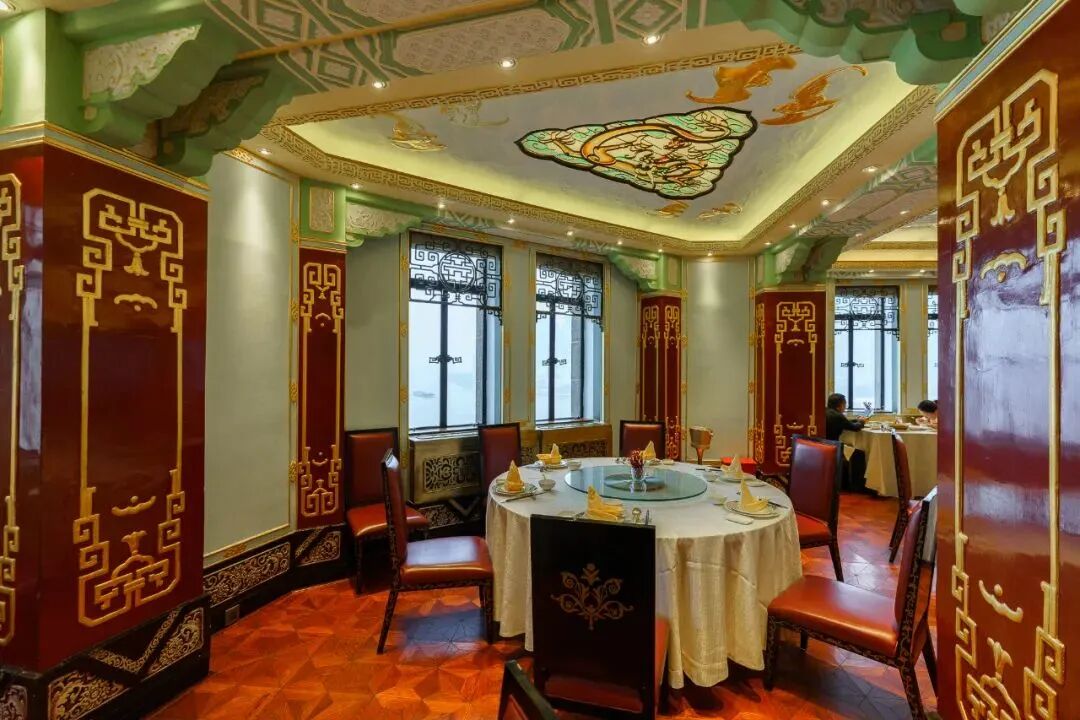 龙凤厅的室内立柱、天花和窗扇保留了30年代华懋饭店时期的装潢。鲜红的大方立柱雕梁画栋,装饰着中国传统龙凤和蝙蝠。石膏天花吊顶上龙凤呈祥、双龙戏珠等图案,喻意祥和……各处细节都彰显着华丽复古的中国韵味!