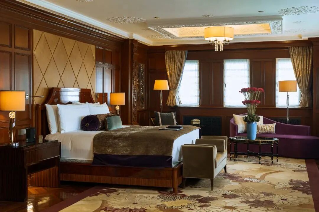 房间宽敞奢华的空间,拥有无可匹敌的江景,俯瞰外滩的万国建筑群,领略上海的旧貌与新颜。据说,沙逊常常站在华懋饭店顶楼他居室的窗口,俯瞰上海的车水马龙的街景。