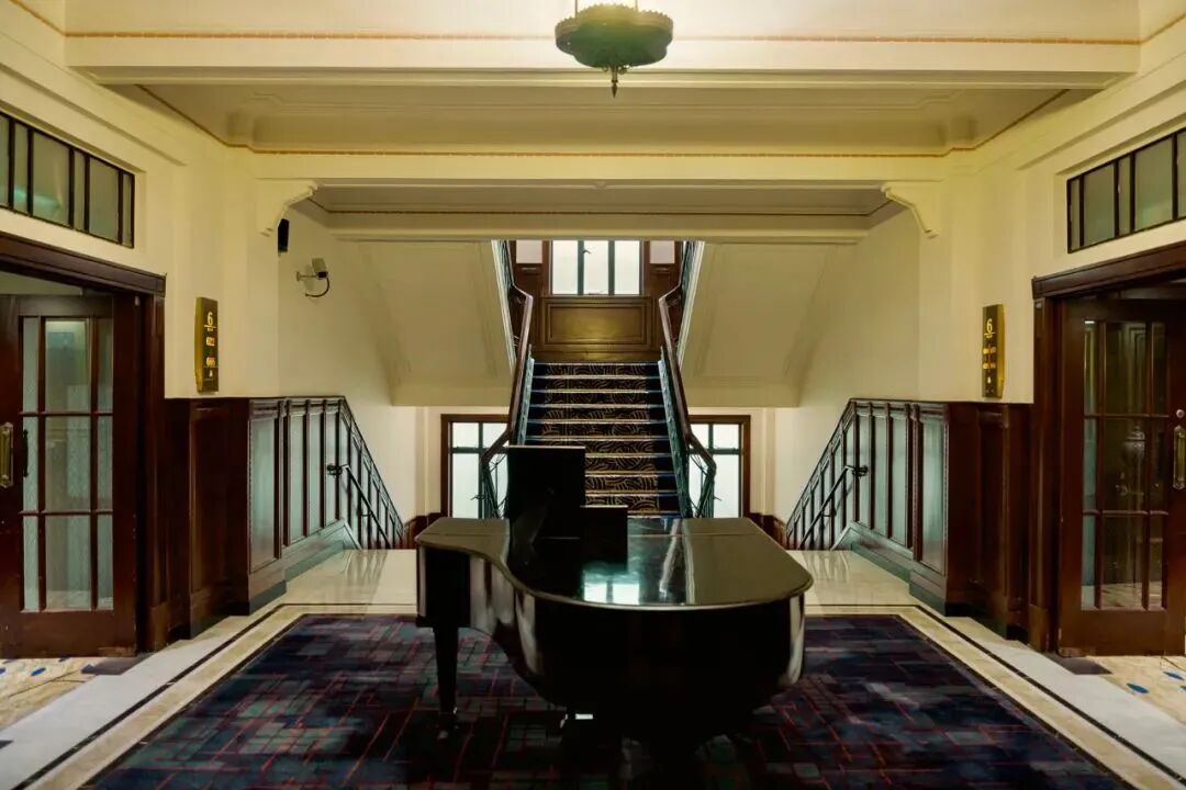 和平厅外面有一架钢琴,这架斯坦威钢琴由沙逊爵士于1927年向斯坦威父子公司特别订制。酒店开业之际,她远渡重洋来到上海,在当时饭店8楼舞厅内为诸多社会名流展示其动人的银色。当时入住过饭店的名流都弹奏过这架钢琴,包括卓别林,科尔波特等人。