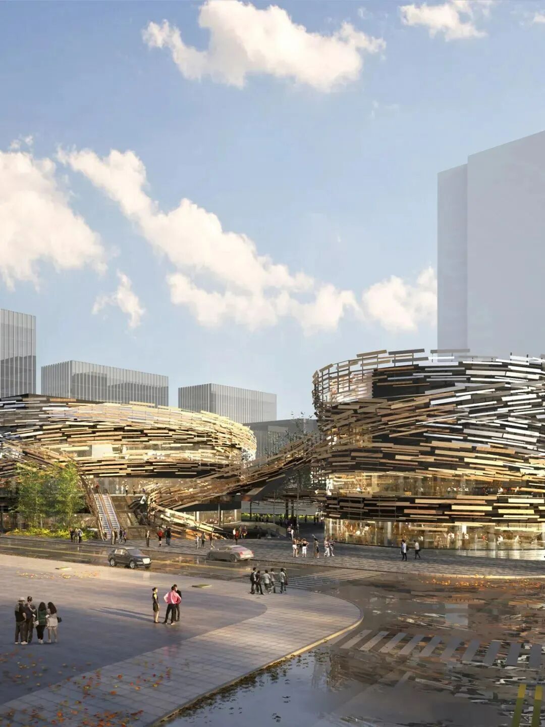 位于中轴位置的双子星剧场尤其吸引人眼球。建筑由国际大师隈研吾亲自操刀设计,两座建筑酷似无数枝条搭建鸟巢,又仿佛一条正在逐渐消散的飘带。建筑、空间、文化、空中商业等无界又交互,十分特别。