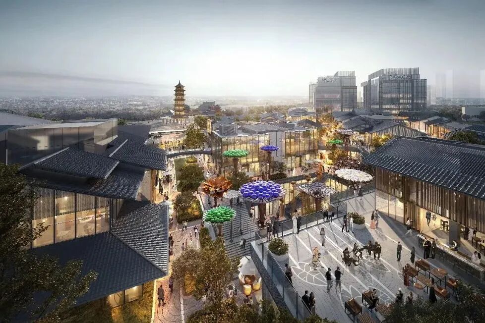 项目对标成都太古里,采用重檐坡顶+现代玻璃石材的立面设计,将传统文化与街区商业完美融合,打造古今碰撞、巷弄交错的现代江南院落式特色开放街区。