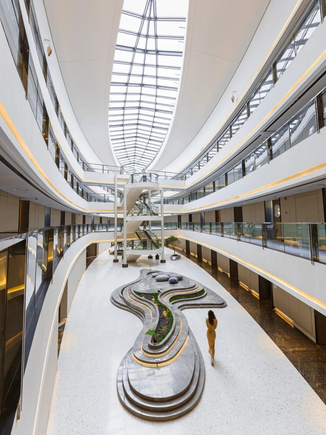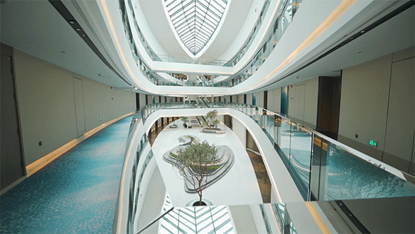 酒店占地面积广阔,郁郁葱葱的园林错落有致,有序延伸接连着游艇码头,更有临湖散步步道。现代滨海风尚与江南山水美学融合,如同一幅静谧灵动的“当代城市桃花源”画卷。