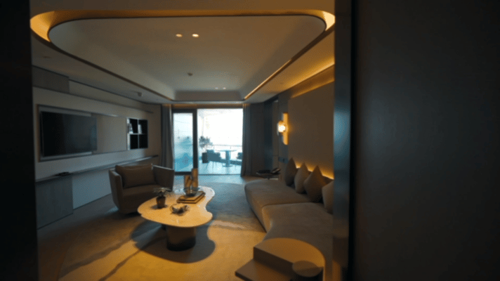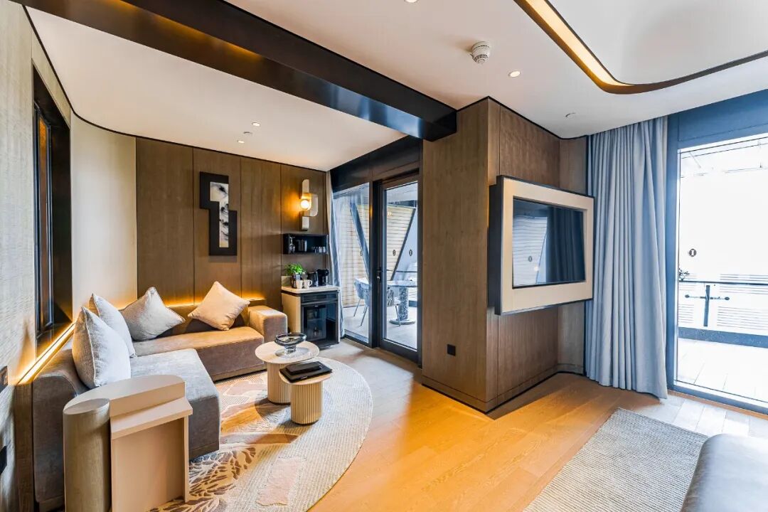 客房宽敞通透,套房面积从85平方米到114平方米不等,80%的客房设有游轮式的观景阳台及宽敞的休息区,充分营造了度假氛围感。