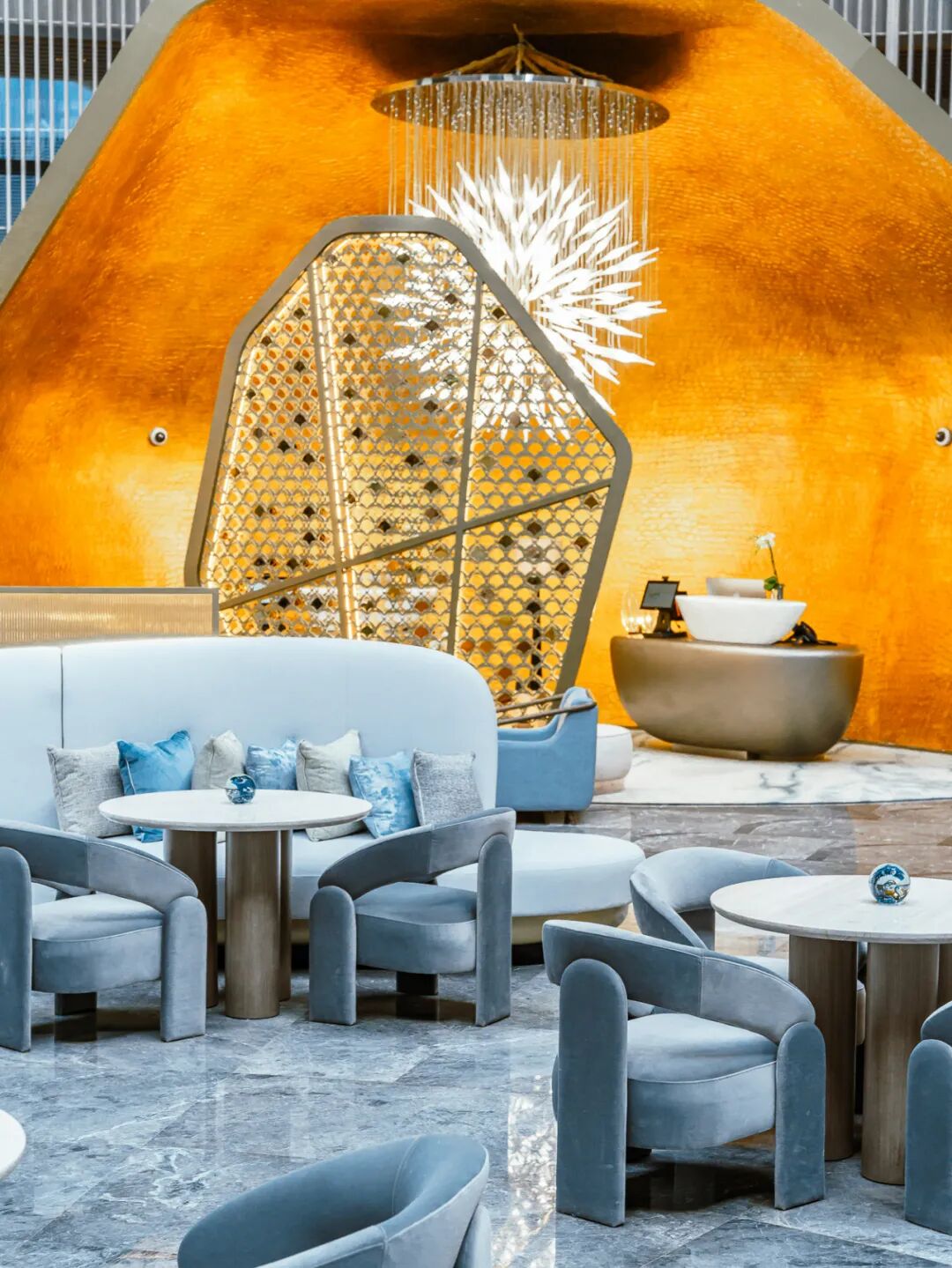 前台背景被粉刷成金铜色,非常亮眼。仔细看,墙面上的图案是鱼鳞,巧妙了呼应了海洋元素。