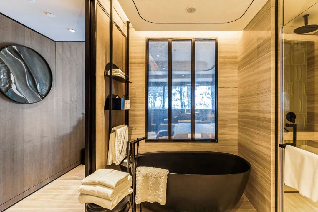 浴室配有超大观景浴缸,独特的黑色也别出心裁。
