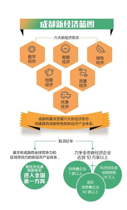 未来,成都将重点发展数字经济、智能经济、绿色经济、创意经济、流量经济、共享经济“六大新经济形态”,构建具有成都特色的新经济产业体系。到2022年,基本形成具有全球竞争力和区域带动力的新经济产业体系,新经济产值达5000亿元以上,新经济总量指数排名进入全国第一方阵。力争全市新经济企业达到10万家以上,其中独角兽企业7家以上,潜在独角兽企业60家以上,科技创业者规模突破28万人。