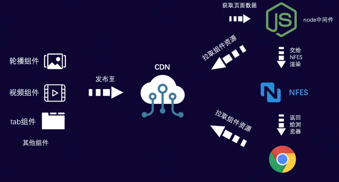 渲染引擎通过ARES相应的API(如:在node端预热组件资源,获取单个组件最新有效版本,资源地址等)获取到资源地址,然后在服务端下载组件的javascript资源文件的文本内容,并通过requireFromString将字符串文件转换为内存变量module,即而完成服务端的渲染,而客户端则动态加载这些异步js,完成客户端的渲染。