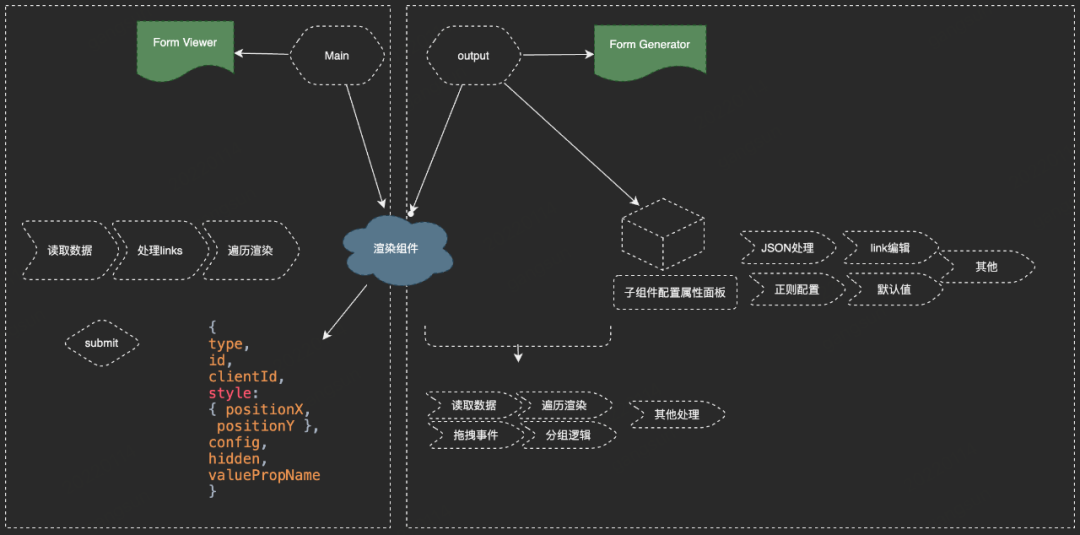 系统有表单生成器编辑面板Form Generator,表单渲染入口Form Viewer两个主要模块。这两个模块共用常规的基础组件如输入框,颜色选择等,还有一些基于业务扩展的复杂组件,例如热区选择,视频上传,数据聚合(JSON列表)等。![]()