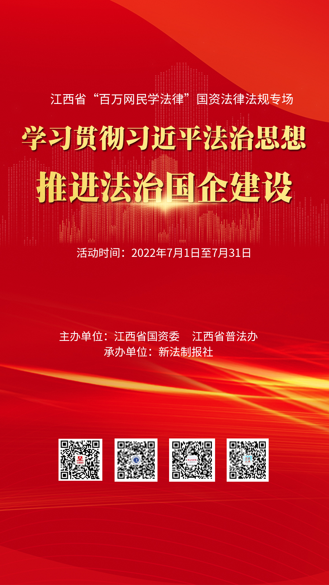 或者登录江西法制网、法治江西网任一网站,点击“‘百万网民学法律’国资法律法规专场知识竞赛活动”,登录专题页面点击“参赛通道”后,实名注册参与在线答题。