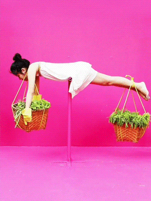 在《正义之秤》里,我用单杠支撑着腹部,脖子和脚踝各吊着一个菜篮,不停地被投入蔬菜,而我要努力保持平衡,双脚被勒得生疼。