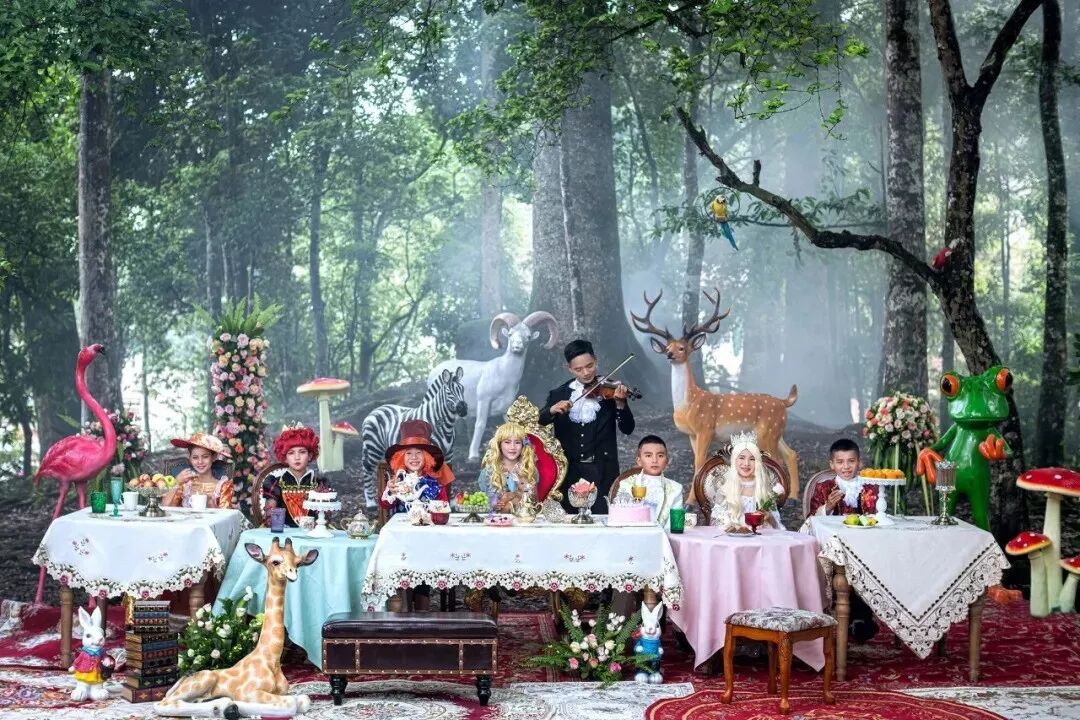 照片的灵感是来源于电影《爱丽丝梦游仙境》,我想为这些孩子们营造一个童话世界,让他们变成童话的主角。