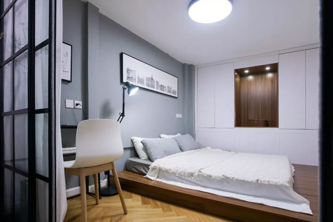 另一间次卧只有2.2米高,由于层高较低,我舍弃了床,改做成矮榻榻米的形式,视觉上减少了压抑感,也可作为储物使用。
