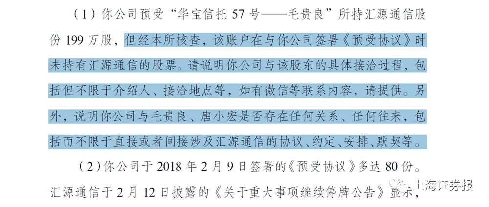 但深交所核查后称,该账户在签署《预受协议》时未持有汇源通信的股票。为此,交易所要求说明公司与该股东的具体接洽过程,包括但不限于介绍人、接洽地点等,并提供微信等联系内容(如有)。另应说明,上海乐铮与毛贵良、唐小宏是否存在任何关系和往来,包括相关协议、约定、安排、默契等。