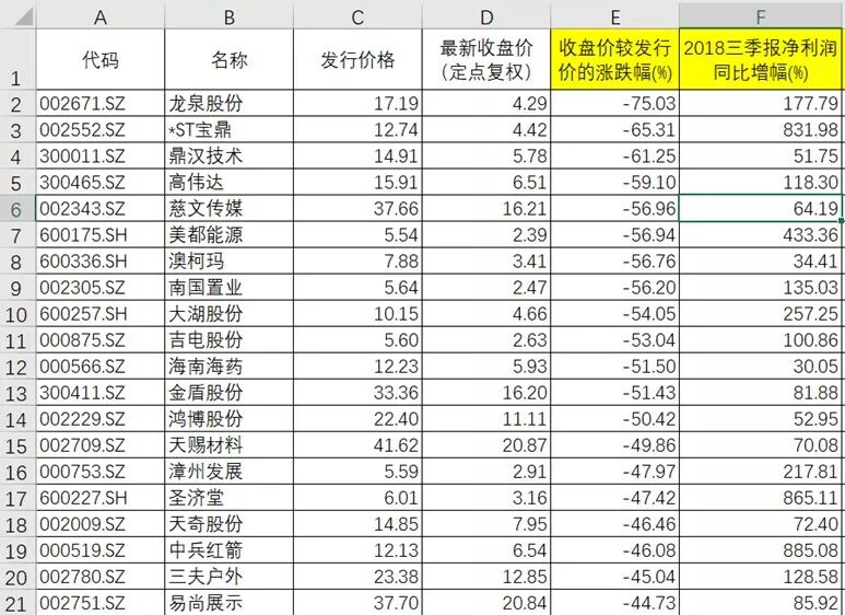重点来了,这几家公司分别是华纺股份、开创国际、慈文传媒、游族网络、三夫户外,跌幅分别为30.29%、34.77%、56.96%、41.21%、45.04%,其中开创国际三季度业绩增速最快,净利润较去年同比增长347.19%,另外,华纺股份、三夫户外三季度净利润增速也超过100%。