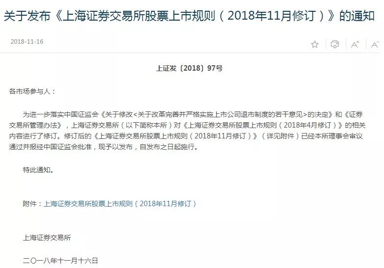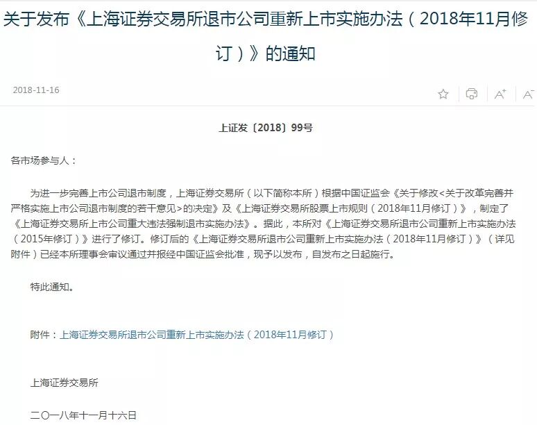 2018年11月16日,上交所在前期征求意见的基础上,正式发布实施《上海证券交易所上市公司重大违法强制退市实施办法》,同时发布《上海证券交易所股票上市规则(2018年11月修订)》和《上海证券交易所退市公司重新上市实施办法(2018年11月修订)》。