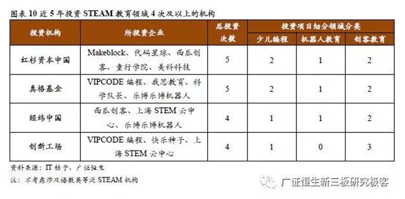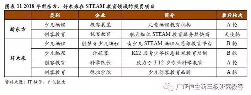 不少K12教育机构也跨界进入STEAM领域,课外培训行业两大龙头新东方和好未来2018年投资的项目也主要在少儿编程、创客教育领域。