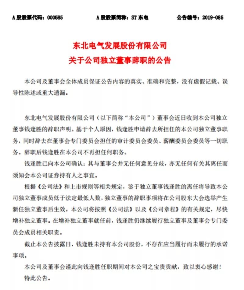 9日晚间,ST东电公告,基于个人原因,钱逢胜申请辞去所担任的公司独立董事职务,同时辞去在董事会专门委员会担任的审计委员会委员、薪酬委员会委员等一切职务。