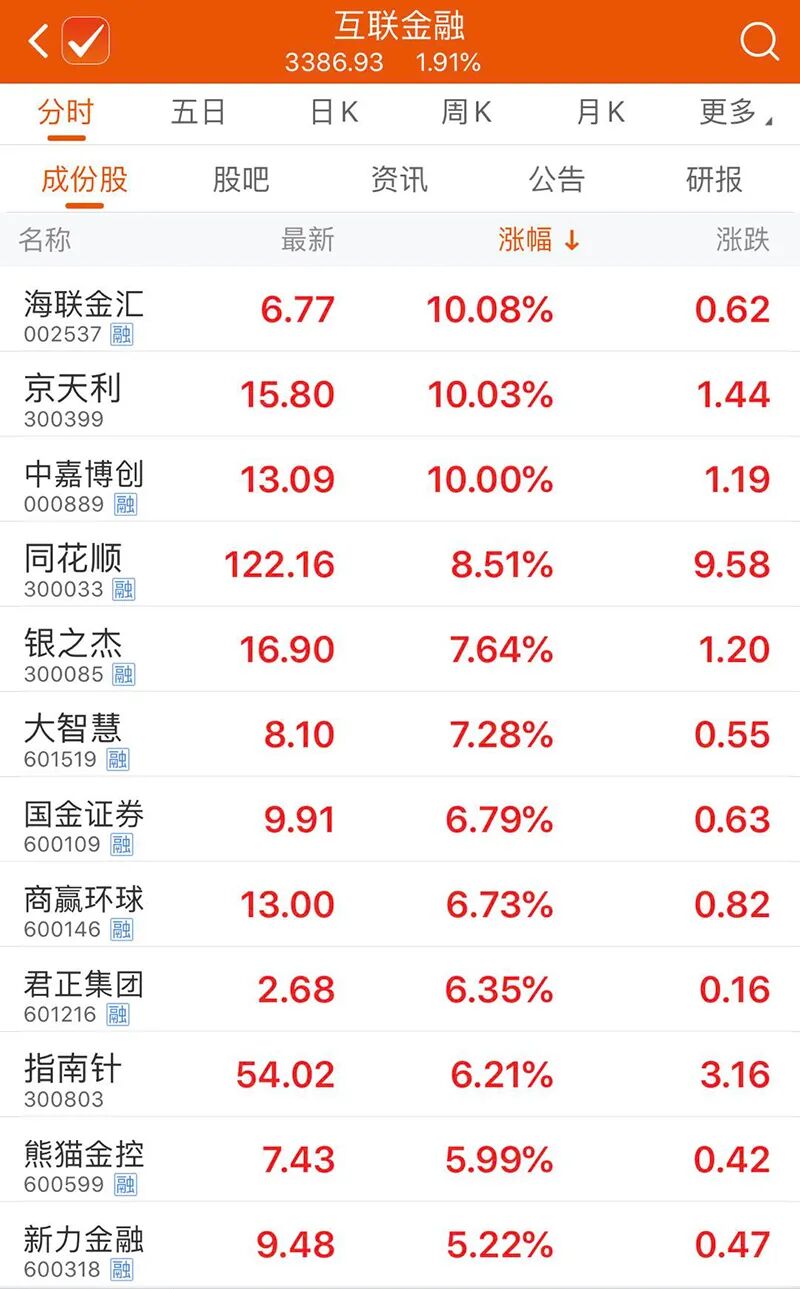 早盘,大金融股全线走强,截至午间收盘,互联网金融板块中,同花顺涨8.51%,熊猫金控、东方财富等涨幅居前。